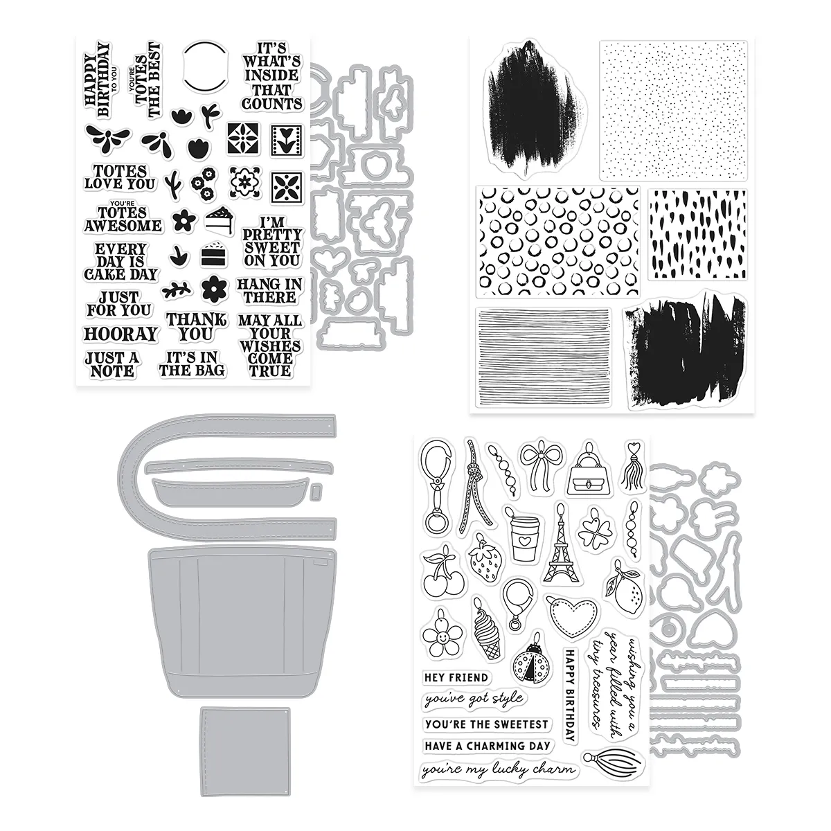 Designed to work seamlessly together, this bundle makes it easy to create custom tote cards, layered textures, playful charms, and cheerful sentimentsall in one coordinated collection.