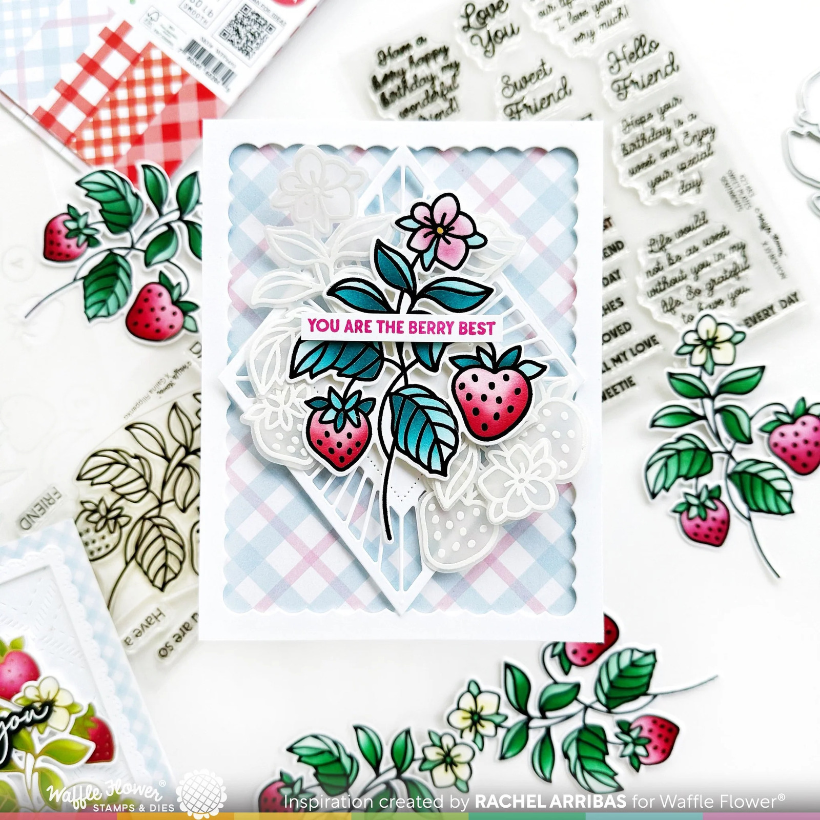 The Sweet Strawberry Stamp set features a lovely stem of strawberries waiting to be picked. Use the coordinating coloring stencil to add colors in media of your choice quickly. A foil plate version and the Matching Die are also available.