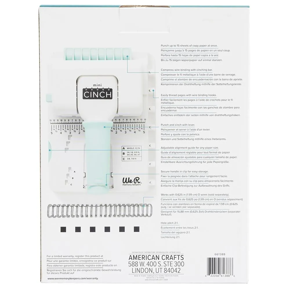 In StockCompact design lets you punch and bind projects up to 12 inches tall. Convenient centering measurements. Designed to work with the best selling 5/8 inch wires. The Cinch Book Binding Machine by We R Memory Keepers makes booking binding quick, easy and affordable. And now the Cinch comes in a new adorable mini size! It is the best binding tool on the market for home, school and office projects. Punch perfect holes with customizable hole spacing on any size project. The Mini Cinch is great for making mini albums, recipe books, customized journals and planners, presentations and more. This package includes one Mini Cinch book binding machine.