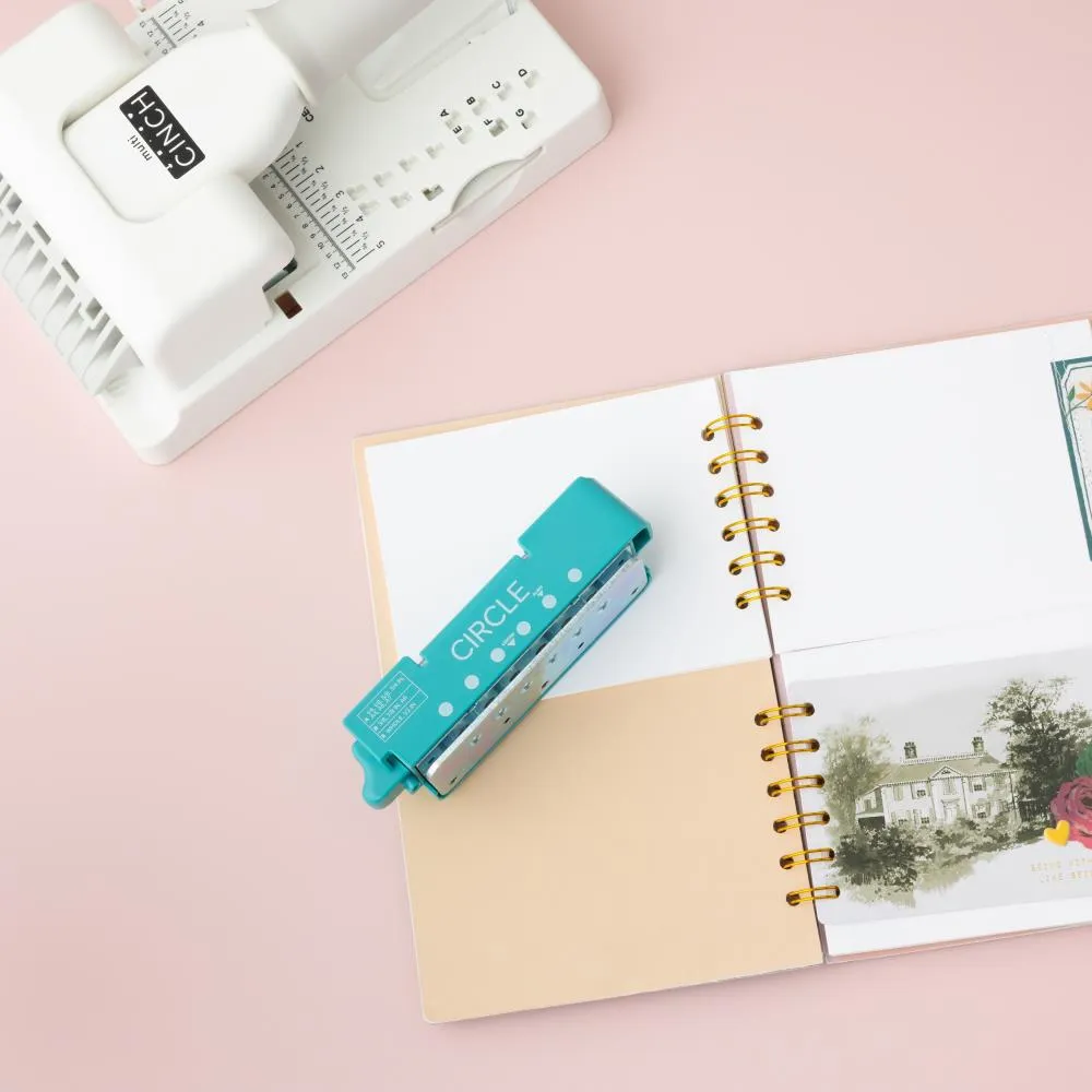 The Multi Cinch Book Binding Machine makes book binding quick, easy and affordable. It is the best binding tool on the market for home, school and office projects. The Multi Cinch comes with two different, interchangeable punch types, circle and disc, and other styles are sold separately. Collect them all and punch perfect holes with customizable hole spacing on any size project. Plastic and metal bindings come in fun, trendy colors, and elastic book bands are perfect for travel journals, planners, and diaries. The possibilities really are endless with Multi Cinch! Includes Multi Cinch base, Disc Cartridge, and Circle Cartridge.