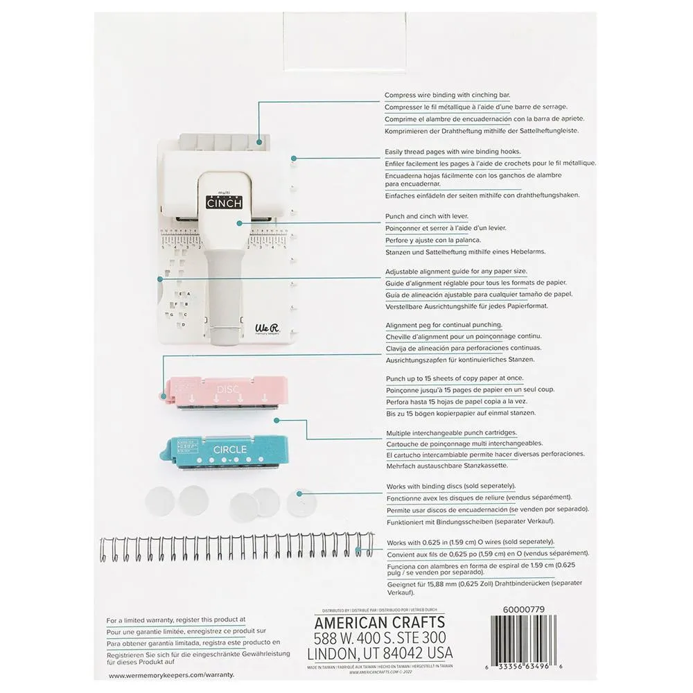 In StockThe Multi Cinch Book Binding Machine makes book binding quick, easy and affordable. It is the best binding tool on the market for home, school and office projects. The Multi Cinch comes with two different, interchangeable punch types, circle and disc, and other styles are sold separately. Collect them all and punch perfect holes with customizable hole spacing on any size project. Plastic and metal bindings come in fun, trendy colors, and elastic book bands are perfect for travel journals, planners, and diaries. The possibilities really are endless with Multi Cinch! Includes Multi Cinch base, Disc Cartridge, and Circle Cartridge.